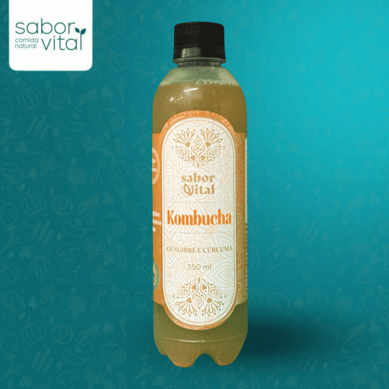 Kombucha artesanal de gengibre com cúrcuma: anti-inflamatória, probiótica e com aquele sabor vibrante que você não esquece.