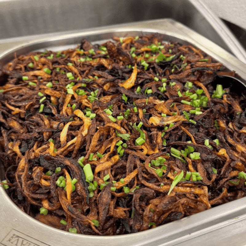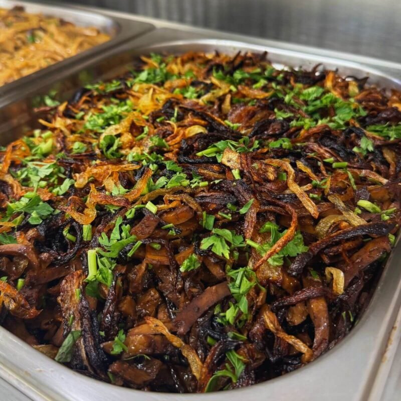Isca de glúten acebolada — proteína de trigo suculenta e bem temperada. Uma opção robusta e saborosa para enriquecer acompanhamentos.