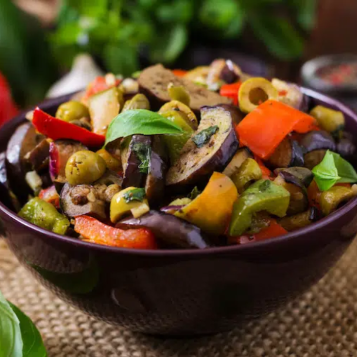 IngredientesBerinjela, cebola, pimentão, uva-passa, azeitona, pimenta-do-reino, azeite e sal.