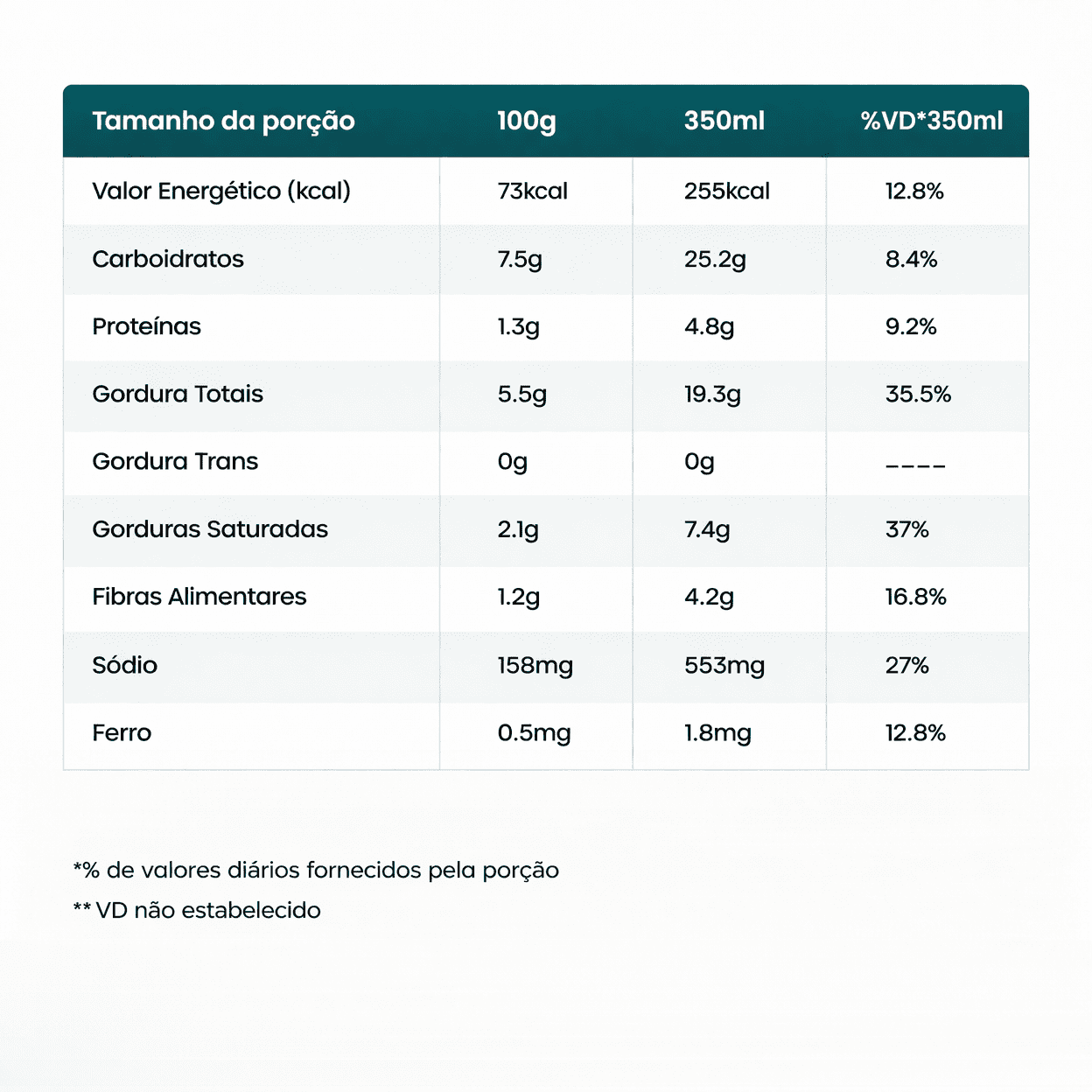 Fonte de vitaminas A, C e K, e compostos prebióticos que favorecem a saúde intestinal. Preparado com ingredientes orgânicos, sem conservantes, com aquele equilíbrio de sabor que só a cozinha artesanal consegue.
